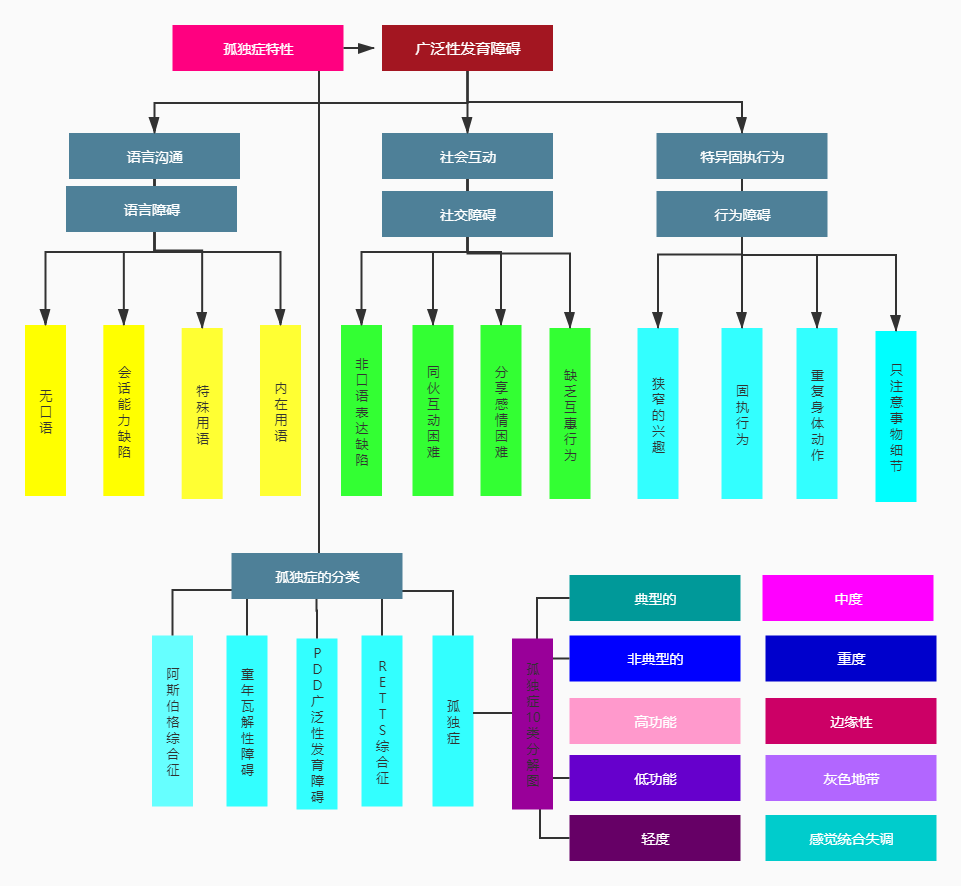 孤独症又分十种典型、非典型、高功能、低功能、重度、中度、轻度、边缘性、灰色地带、感觉统合失调。以典型为例:语言障碍、行为障碍、互动障碍,必须同时具备,缺一不可。